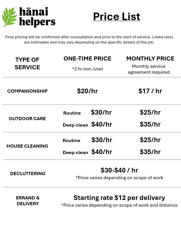 We offer affordable, non-medical support for everyday life — from homemaking and companionship to yard care and decluttering. While we proudly serve kūpuna and those in need, our services are open to all in the community.